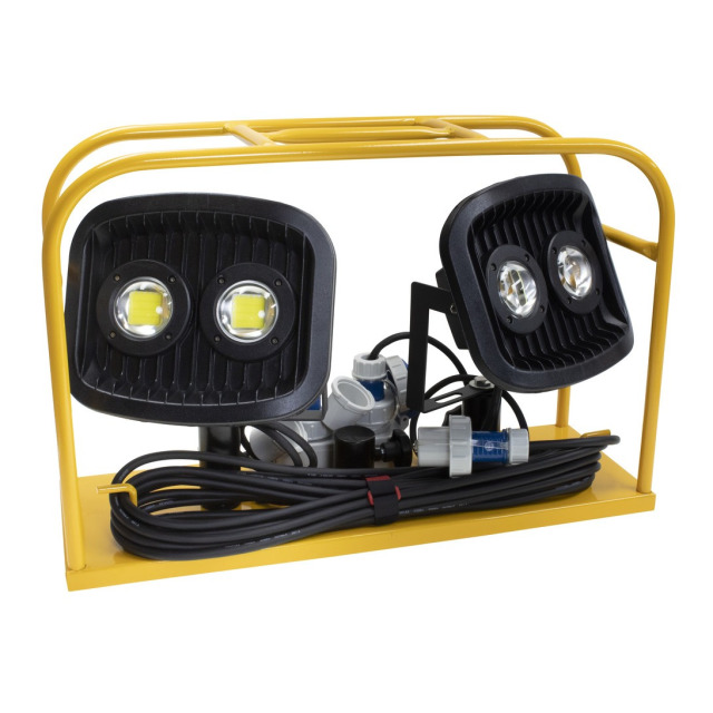 Scheinwerfercontainer, Satz mit 2 LED-Flutlichtscheinwerfern 60 W. Stabiles Stahlrohrgestell gelb beschichtet, integrierte Kabelaufwicklung. 2 Aufsteckzapfen C DIN 14640 zur Aufnahme von Scheinwerfern mit Aufsteckbohrung A DIN 14640. Aufsteckbohrung A DIN 14640 zum Aufsatz auf ein Stativ mit Aufsteckzapfen C DIN 14640. 2 Schuko-Steckdosen IP68, 10 m Anschlussleitung H07RN-F 3G1,5 mit Schuko-Stecker IP68, 230 V. Gesamtmaß (LxBxH) 635x230x420 mm, Gesamtgewicht ca. 10,0 kg Lieferung einschließlich 2 LED-Flutlichtscheinwerfern, je 60 W, je 6.000 Lumen, Scheinwerfer frei schwenkbar für 300° Ausleuchtung, IP65